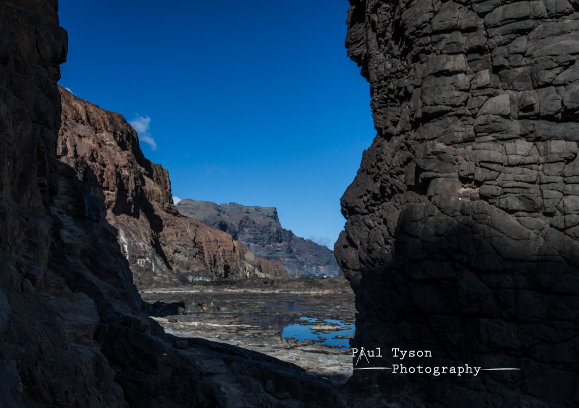We had to leave, we packed our bags and once more started to climb the steep sides of St Helena’s Southern Cliffs. The sun was setting, lights streamed through gaps in the rocks, creating striations of black and orange. The green slopes on the central ridge came into view in the distance, like an oil painting of colour, the greens of the peaks framed by deep blue above and orange, purples and reds of Sandy Bay amphitheatre below.