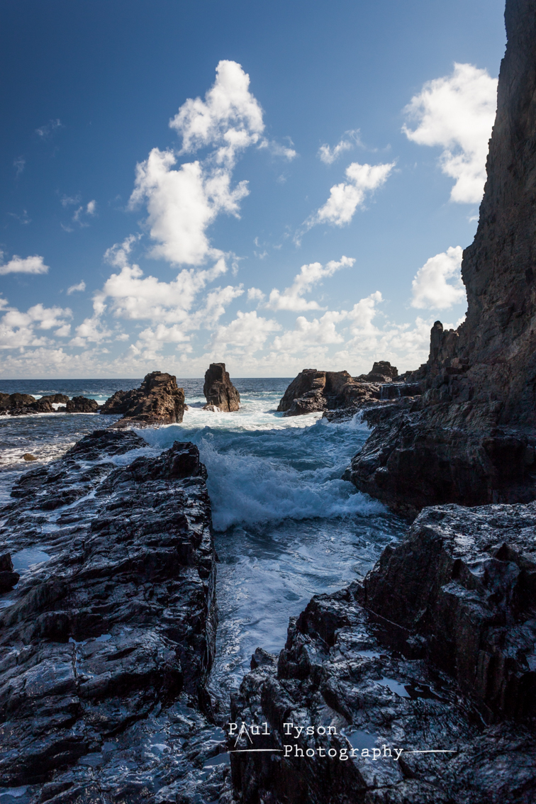 And so it was we reached our destination, Lots Wife Ponds. A huge pillar of rock greeted us to our left, the gap between it and the cliff face providing views of an elevated and tranquil pool. To our right, waves surged into a gully, racing up and increasing in size before spilling over into a second, lower, and somewhat turbulent pool. The sounds of huge waves bellowed against the rock wall that had now become apparent at the edge of this rocky platform, holding back the Atlantic on one side, and holding in our tranquil swimming pools on the other.