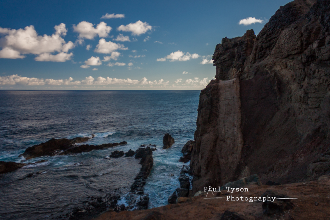 With time running short we dried off, regrettably having to leave our little Eden behind. But not before I ventured onto the rock wall to witness the Atlantic below. Very aware of the spray shooting upwards some 20ft and the deep, bellowing of air being trapped and squeezed upon this natural barrier I cautiously climbed up the wall and poked my head up above the parapet. Gaining in confidence I could see the concave wall, worn away at its base and now forming the curve so commonly seen in man-made breakwaters. Waves hitting the base of the wall were deflected in a huge curve back out to sea. The power was extraordinary, 15ft waves booming and shaking, punching at the wall and then sucking back, as if trying to pull the wall down, angry, determined and relentless, and yet the unyielding wall stood firm, protecting Bev and I and stopping the waves from cutting down yet more of St Helena’s cliffs.